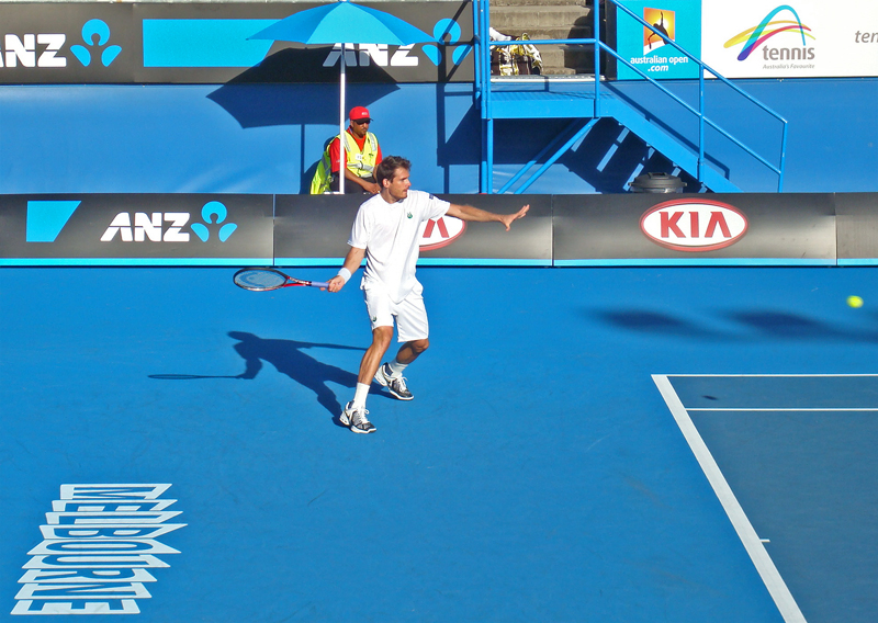I saw a postponed match between Jarkko Nieminen, of Finland, and Australian Nick Lindahl (pictured above). Their match began on the first day of the tournament, was delayed and ultimately rescheduled to the second day, due to the unseasonably wet weather Melbourne experienced that first day. Nieminen eventually defeated Lindahl 6-2, 7-5, 6-4.