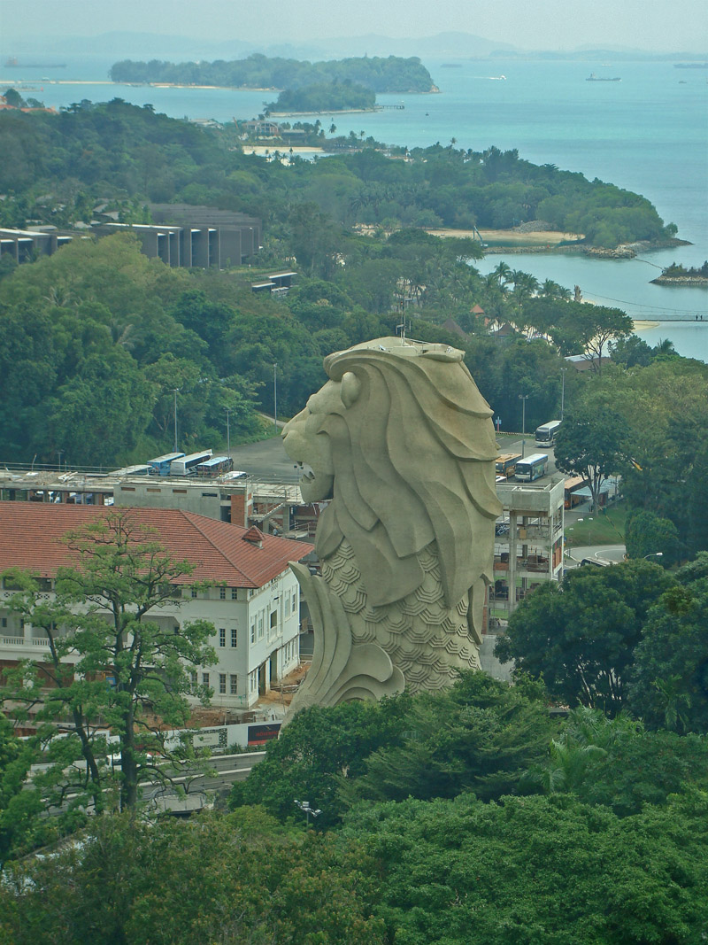This last photo (above) shows the country’s largest statue of a Merlion on Sentosa Island. (There are five official statues of merlions around the country.) The Merlion is a mythical creature with the body of a fish (thus, the “mer,” meaning the sea) and the head of a lion, and it has been the symbol of Singapore since the 1960s. The fish is meant to represent Singapore’s ancient name, Temasek, which means “sea town” in Javanese, and the lion’s head represents Singapore’s more modern name, Singapura, which means “lion city” in Malay.