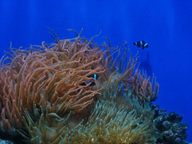 Right next to the jellyfish were the popular anemonefish, a.k.a. clownfish (shown above). They’re very cute little fish, and they’re the only ones that can live on a sea anemone (the poisonous plants that shelter the fish). I was surprised to learn that clownfish are hermaphrodites—they’re born male and can spontaneously change genders when needed.
