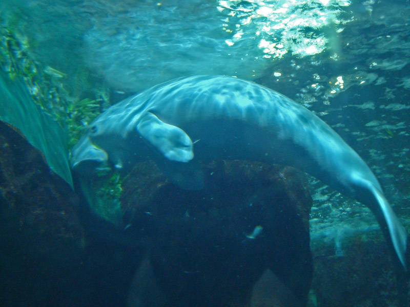 And last, but not least, above is Gracie, a dugong. Although she’s already about 12 years old, Gracie is apparently still growing. When I visited in February 2010, she weighed about 160 kilos/353 pounds, and she was about 1.67 meters/5.5 feet long. Dugong are found in the Great Barrier Reef, in Australia, and off the southern coast of New Guinea, and they’re closely related to the manatee.