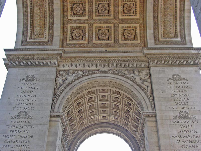 The Arc honors all those who have fought for France, and it lists the names of military leaders from the French Revolution and the Napoleonic Wars on the inside. It also lists the names/locations of major battles, which you can see in the photo above.