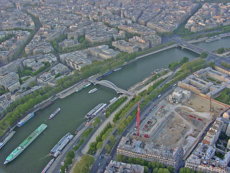 The view above, as you can probably guess, is looking out over the city of Paris. You can clearly see the Arc de Triomphe right in the center of the photo and the famous tree-lined Champs-Élysées running from the Arc, through the city. The view below is looking down from the Eiffel Tower to the Seine River below.